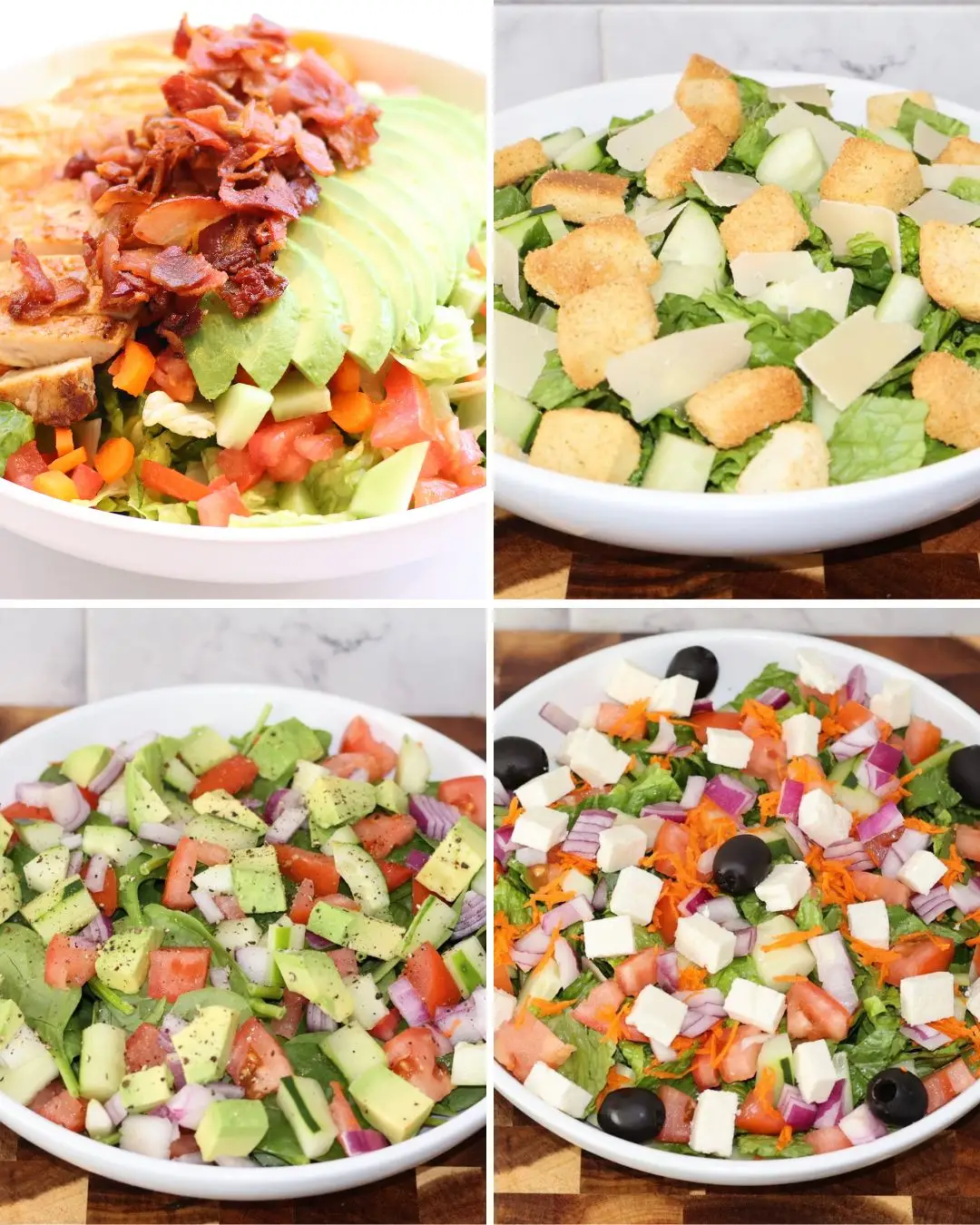 Romaine lettuce, tomatoes, red onions, black olives, protein of choice, feta cheese, and pepperoncini peppers on the sideGreek Salad